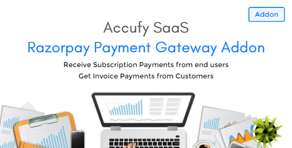 Razorpay Payment Gateway addon is only for Accufy – SaaS Business & Accounting Software system. Using this addon you can receive payments from your end user subscriptions fees and your end users (business owners) will receive invoice payments.