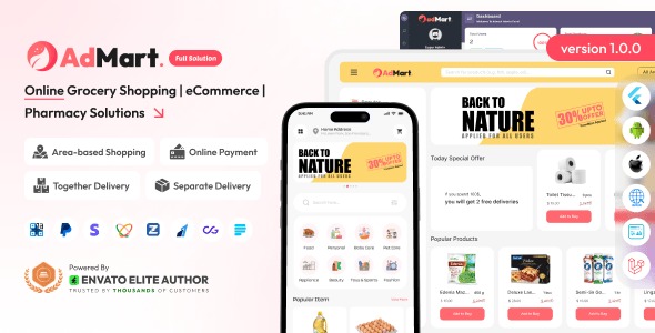 adMart is a powerful, full-featured online grocery and pharmacy eCommerce platform designed for fast launches, seamless delivery, and scalable business growth. Built with Flutter and Laravel, it offers a complete package including a user-friendly mobile app, robust admin dashboard, and dedicated delivery panel — all optimized for performance and usability. Whether you’re selling groceries, medicine, or everyday essentials, adMart makes it easy to manage products, accept online payments, track orders in real-time, and engage customers with OTP login, push notifications, flexible delivery zones, coupons, and multi-language support. With seamless integration of top payment gateways (PayPal, Stripe, Razorpay, SSLCommerz, Flutterwave, and more), adMart is ideal for solo entrepreneurs, startups, or developers who want to deliver a complete solution to their clients.