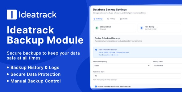 The Backup Module for Ideatrack provides advanced database backup and compression capabilities. It automatically compresses database-only backups to save storage space and improve transfer speeds.
