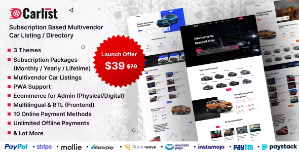 Carlist comes with 10 automated payment gateways – Paypal, Stripe, Mollie, Razorpay, PayTm, Instamojo, Flutterwave, Paystack, Mercado Pago, Authorize.net & unlimited offline gateways for payment. It has currency settings option.
