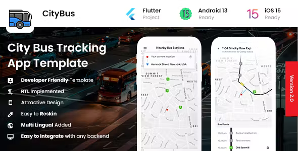 BustApp app tracks buses live and tell you what time your bus will reach your stop. So now, you never have to wait at a bus stop ever again. As well as you can book ticket right from your app before get up in to the Bus. Even you can set a reminder to get an alert when your stop arrives. The city bus App can be a great choice. It is a modern-based and easily customizable App template.BustApp app tracks buses live and tell you what time your bus will reach your stop. So now, you never have to wait at a bus stop ever again. As well as you can book ticket right from your app before get up in to the Bus. Even you can set a reminder to get an alert when your stop arrives. The city bus App can be a great choice. It is a modern-based and easily customizable App template.