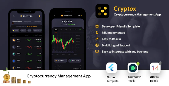Crypto Prices, Charts – Wallet & NFT Tracker Android + iOS App UI Template – FLUTTER 2 – Cryptox