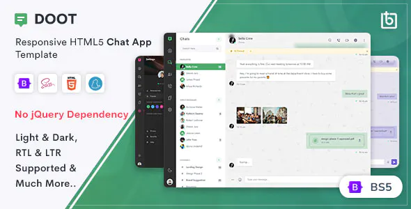 Doot is a powerful and responsive HTML5 chat template built with Bootstrap 5 and JavaScript. Doot allows you to add new users, create channels or groups, Reply – Forward – Copy & Delete messages with JavaScript. We have provide Audio call, Video call popup design. It’s a fully responsive in all devices. We have created JSON files for contact, users & groups messages and managed them with pure JavaScript. Also, we have provided a theme background color and image options for a modern look. Doot provides best HTML template for new generation chat application using JavaScript. Please note that we have not used any backend related code in this application. Feel free to contact us via support for any questions or suggestions so we can try to add them in future updates.