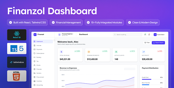 Finanzol is a feature-rich, fully responsive React 19 financial dashboard template built with TypeScript, Tailwind CSS 4, and Vite 6. Designed for startups, SaaS products, and fintech applications, it provides over 20 ready-made pages, 50+ UI components, and a complete mock data layer — giving you a production-quality starting point for any financial web application.