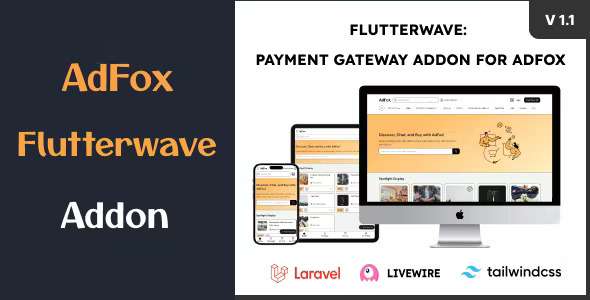 This addon is specifically designed for the AdFox platform, offering a robust and secure Flutterwave payment gateway integration. Note: This is an addon for AdFox, and thus requires the AdFox platform. Make sure you have purchased AdFox before purchasing this addon.