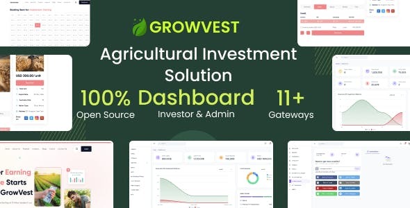 GrowVest, your gateway to sustainable agricultural investment opportunities. With GrowVest, you have the power to invest directly in carefully curated agricultural projects, reaping both financial rewards and the satisfaction of supporting responsible farming practices. Dive into a diverse array of projects spanning across crops, and innovative agrotech initiatives. Whether it’s organic fruit orchards, high-yield grain farms, or cutting-edge aquaponics ventures, GrowVest provides a platform where your investments fuel growth in the agricultural sector while securing returns for you. GrowVest script has 12+ automatic payment gateways and unlimited offline payment gateways and it has built with the latest in web development technologies, including Laravel, Inertia.js, Vue.js. It has included 2 click web installer to install the script from User Interface mode.