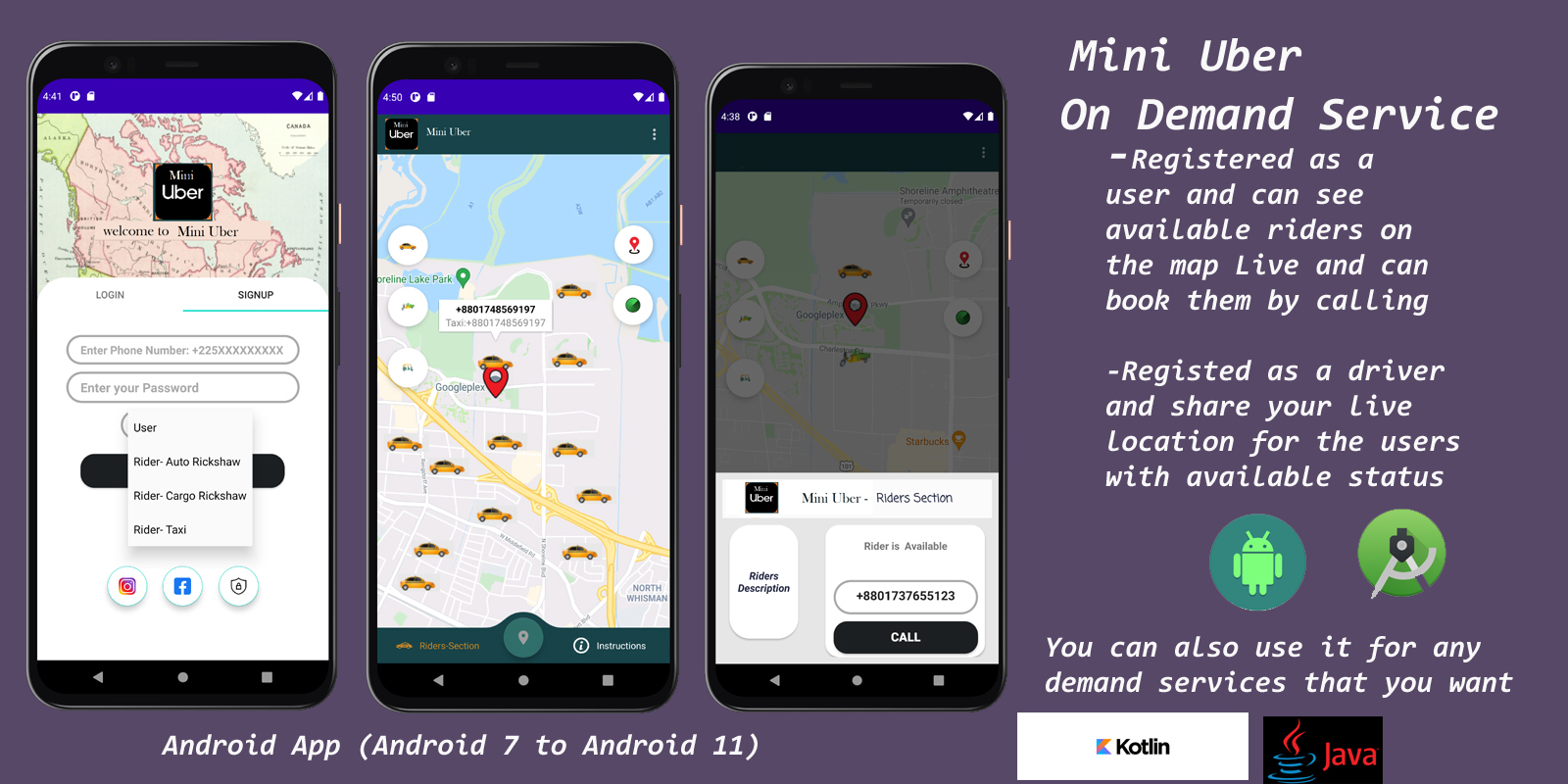 Mini Uber – On Demand Service[with Admin App] Be a Rider or Get Riders, Book them, Make a Ride… Real-Time Live GPS Tracking System