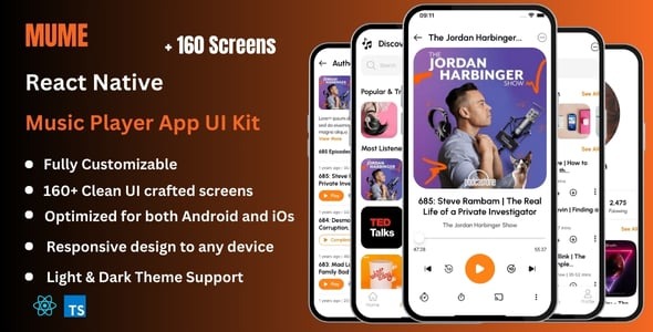 Mume is a comprehensive and feature-rich React Native UI Kit Template designed specifically for creating podcast or music player and streaming Application using React Native CLI. With its extensive collection of more than 160 user screens, pre-designed components, and various layouts, Mume significantly accelerates the development process, making it an excellent choice for developers looking to build a high-quality music player, streaming, podcast or audiobook app.