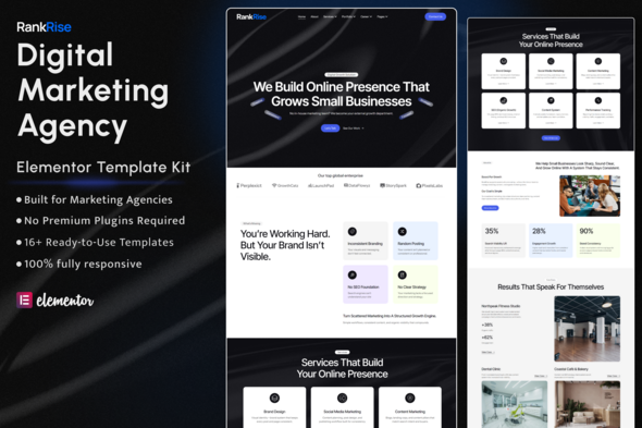 RankRise is a modern Elementor Template Kit designed for digital marketing agencies, SEO consultants, branding studios, and growth-focused service businesses. With a clean dark aesthetic and structured layouts, it helps you present services, case studies, and results with clarity while building trust and generating leads.
