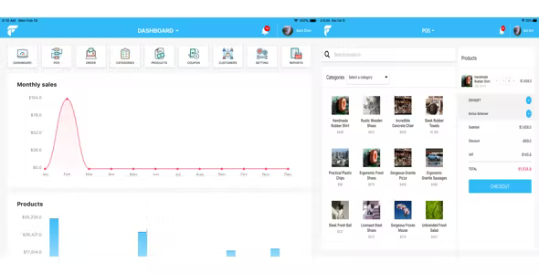 RPOS is built by React Native for app and Backend by NodeJS and MongoDB. It’s POS app include all basic components POS app such as: Customers, Products, Categories, Coupon, Orders, Reports, Settings…