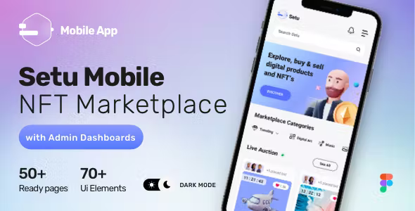 SETU M – NFT Marketplace with Admin Dashboards – Figma Template Setu M is a very modern NFT’s & Digital Products Marketplace designs Mobile Ui Kit targeting the Marketplace space where users can buy, sell & auction. This is an awesome application designs with admin dashboards & reporting included. Also include breathtaking light & dark edition.