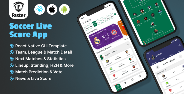 Introducing Faster – Soccer Live Scores App, a versatile React Native app template designed to deliver real-time football match updates, scores, and statistics. Whether for Android or iOS mobile, Faster provides everything you need to keep football fans engaged and informed, making it the ideal solution for developers aiming to create a comprehensive football live score application.