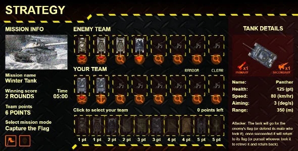 “Tanks Battle Field v3.0” offers two playing modes; “Capture the Flag” and “Death Match”. In “Capture the Flag” mode, your team must capture the enemy flag and returns back to its own flag. In “Death Match” your team has to eliminate all enemy forces. There are Several missions and maps available. Each mission has its own challenges, you have to face certain kinds and numbers of enemies, you have to score the winning score in the given time, you have to manage your given team points wisely and assemble the right team for each mission. Some missions require fast tanks, others require powerful tanks, others require maximum team size, others require duplication of certain roles. Define your strategy in each mission by using your team points to select your team members and assign their roles. You will pass a mission when your team scores the winning score and the next mission will be opened with other challenges. There are 10 tanks to choose from, each has it own criteria and weapons and there are 4 strategic roles you can choose between.