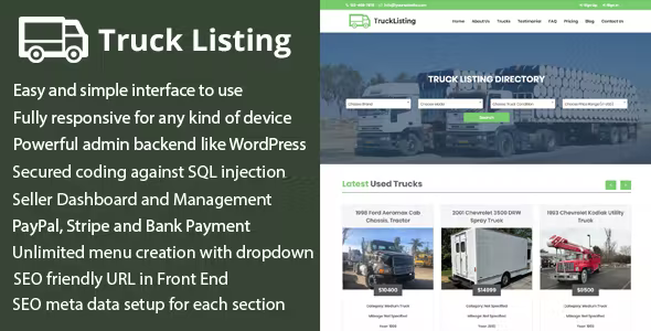 Trucklisting is a responsive truck listing directory Content Management System (CMS). Sellers can register and manage items easily through making a payment through PayPal, Stripe or Bank. In this CMS, seller will give their truck advertisements (to sale new and used trucks) through paying to the website owner. Visitors will come and see the trucks and contact the sellers through their email, phone or message forms for each individual trucks.