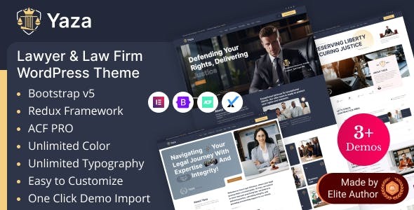 Yaza is a modern responsive WordPress theme for Law Firm & Legal Services. It comes with multiple homepage variations with inner pages and blogs. The theme is developed using Elementor, Redux, ACF Pro, Bootstrap 5, and Sass.